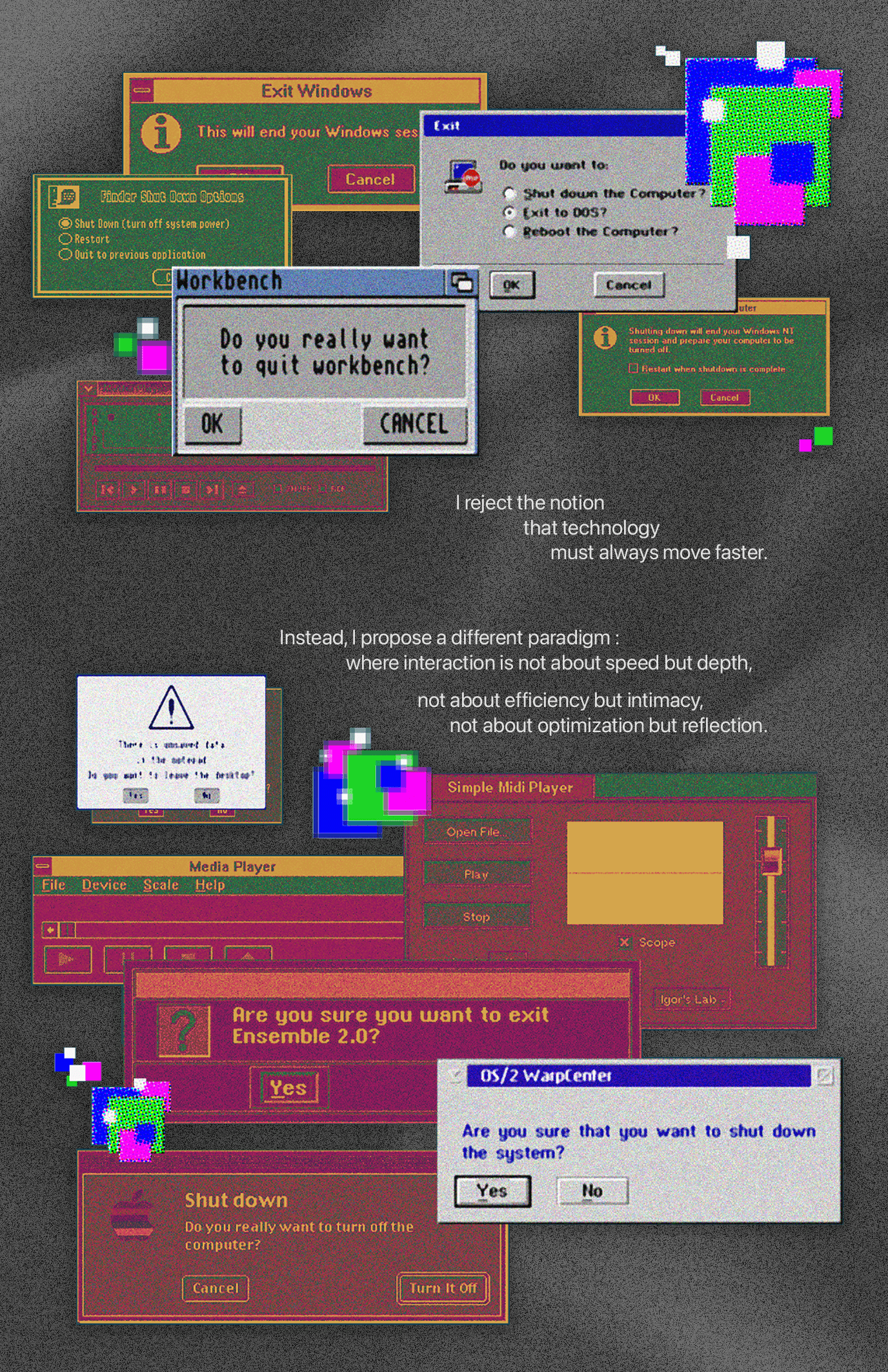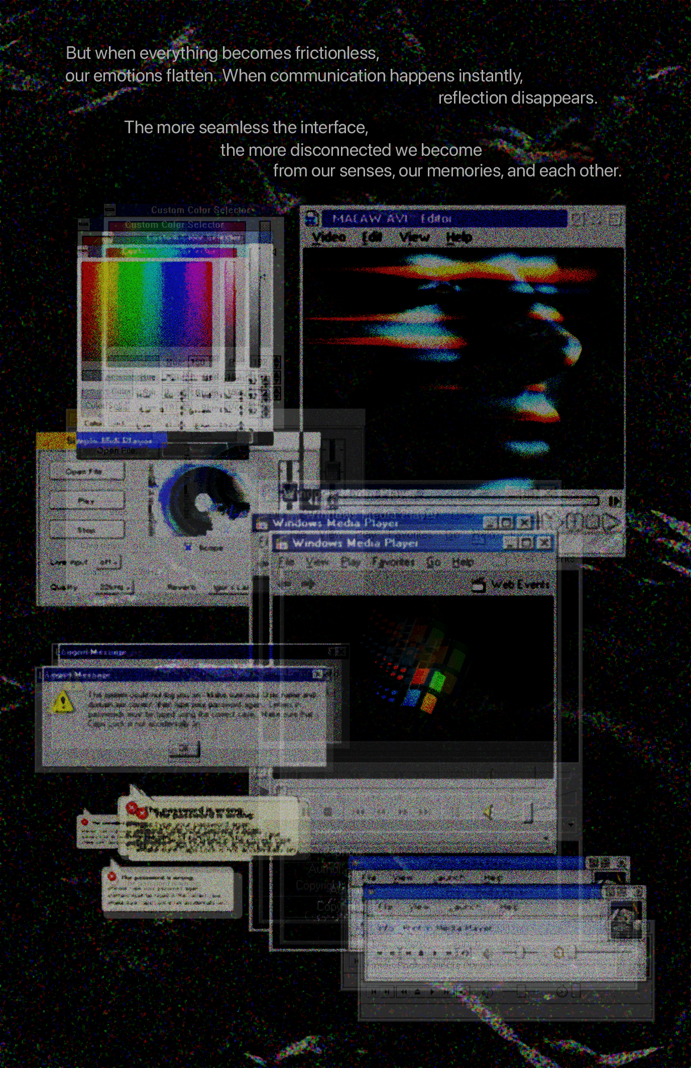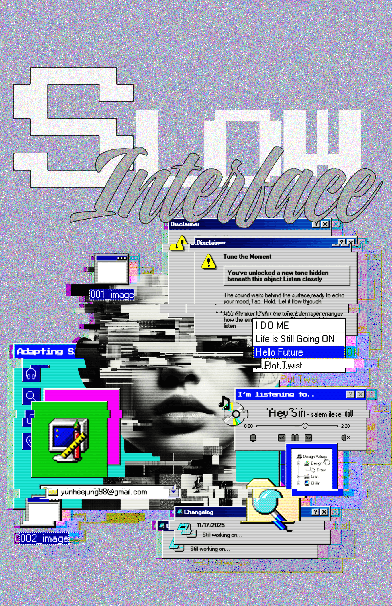 Slow Interface is a conceptual design manifesto that visualizes the emotional cost of speed-optimized digital interfaces. Using distorted UI elements, compressed system windows, and frozen interaction states, the project explores slowness as an act of care—reframing interfaces as spaces for reflection, presence, and emotional trace rather than efficiency and immediacy.