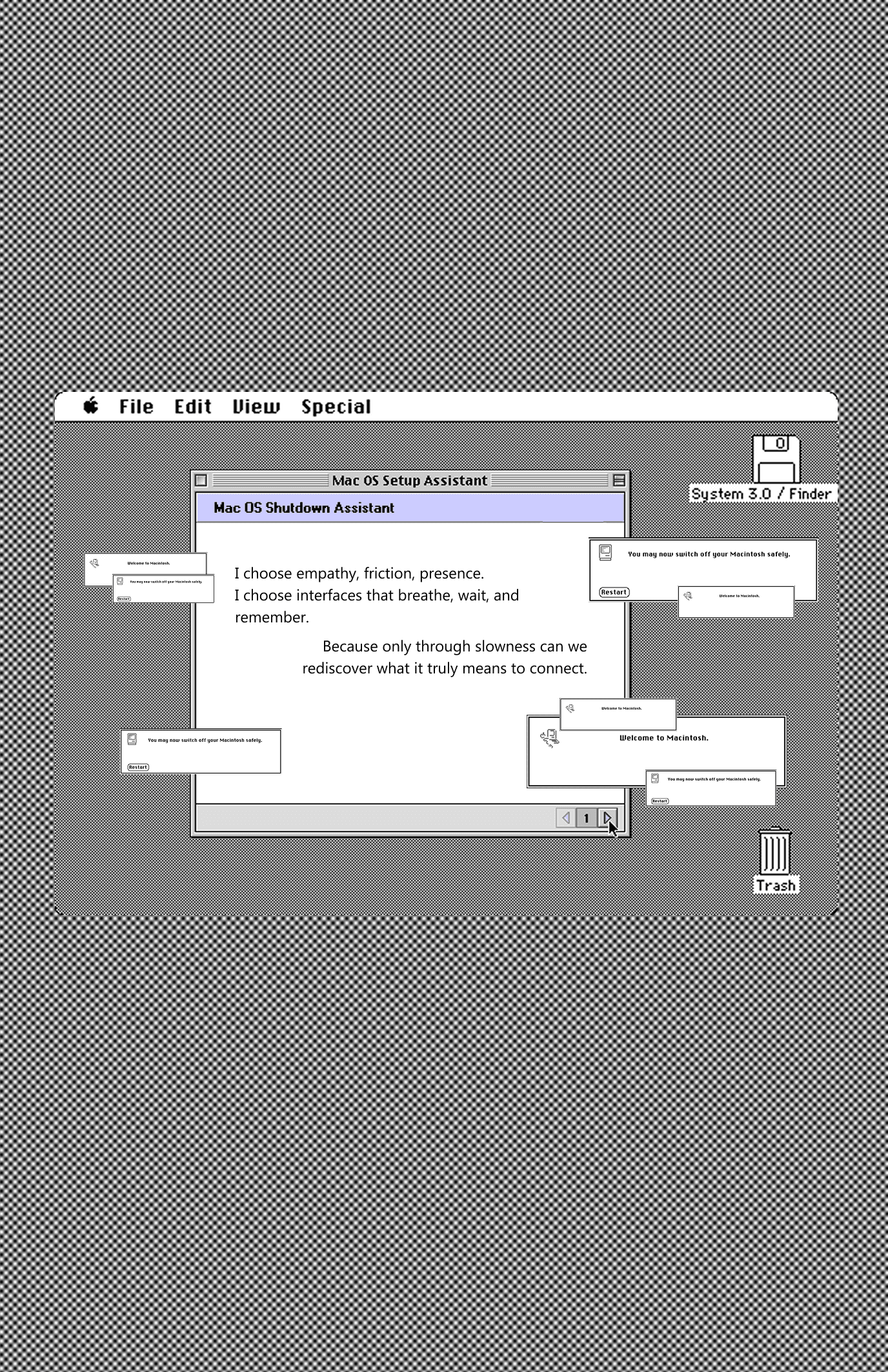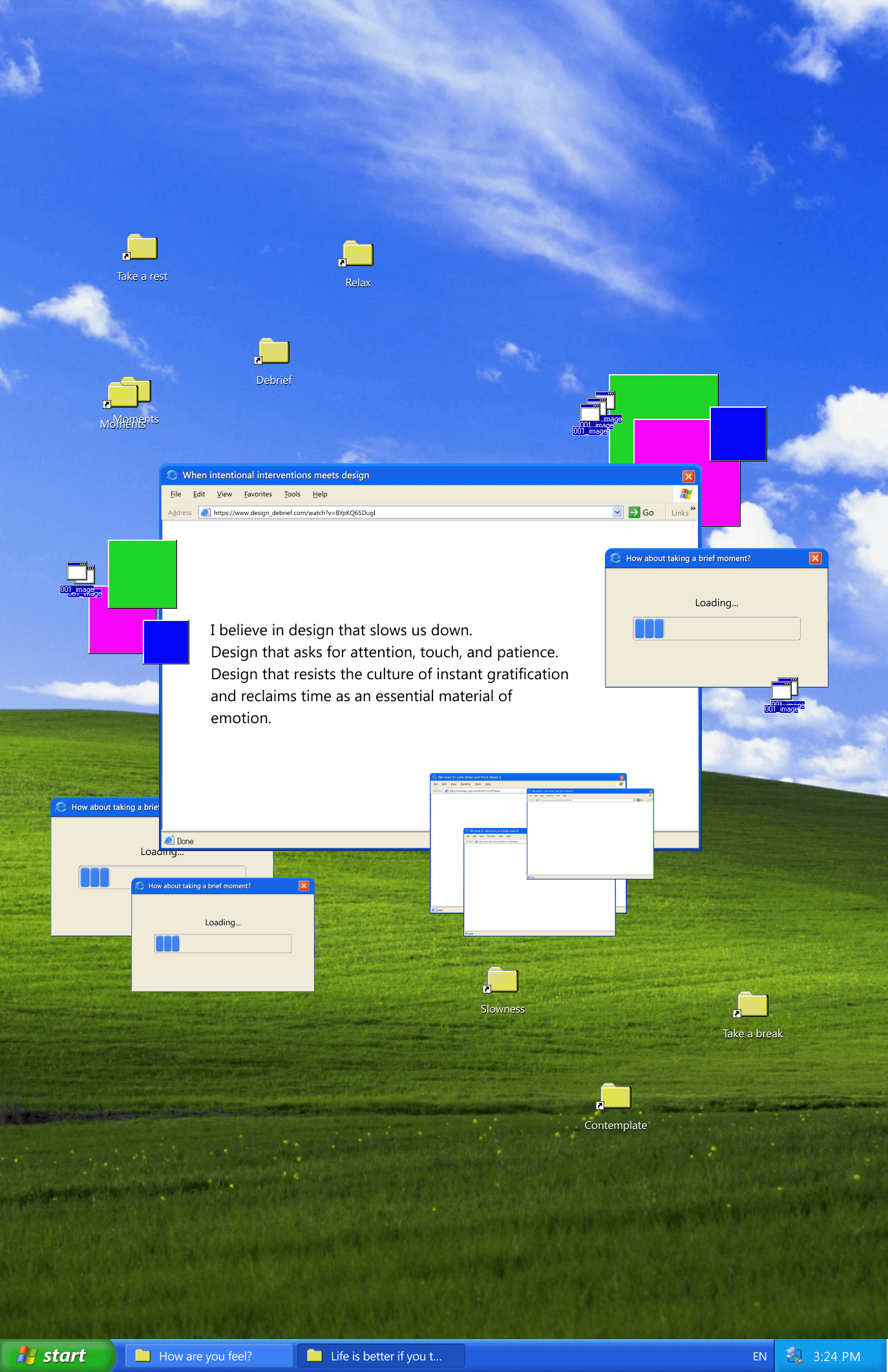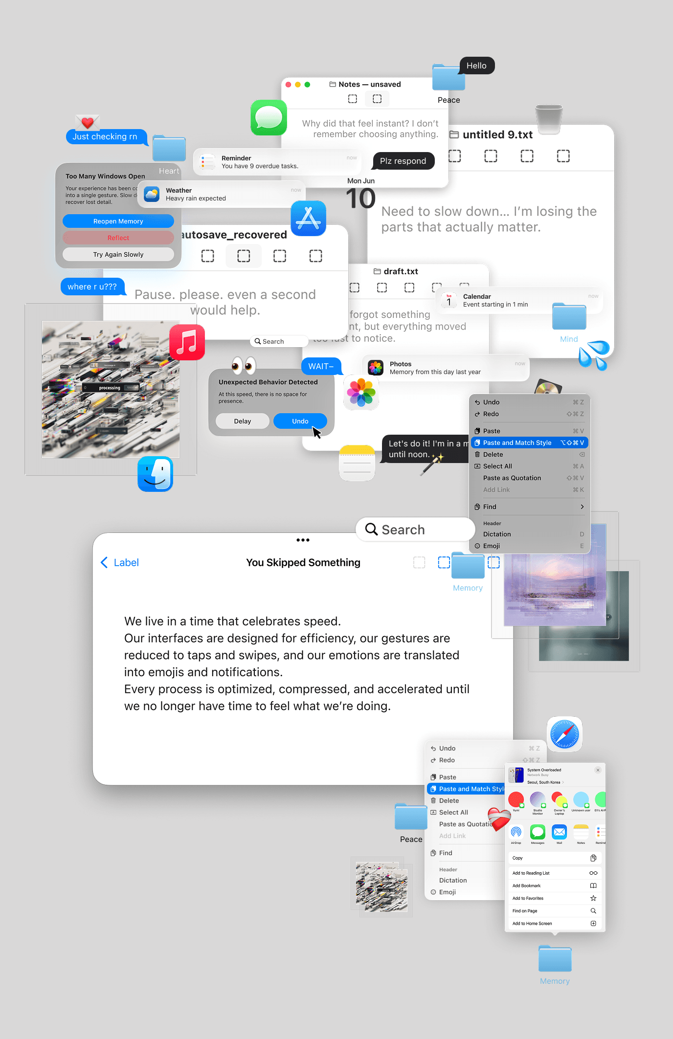 Slow Interface is a conceptual design manifesto that visualizes the emotional cost of speed-optimized digital interfaces. Using distorted UI elements, compressed system windows, and frozen interaction states, the project explores slowness as an act of care—reframing interfaces as spaces for reflection, presence, and emotional trace rather than efficiency and immediacy.